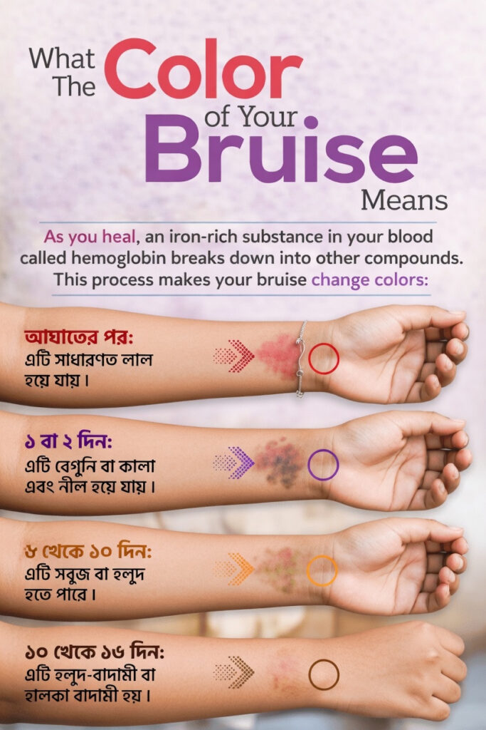 ঘর গুছাতে গিয়ে হঠাৎ টেবিলের কোণায় হাত ঠেকে গেল। তখন খুব একটা গুরুত্ব দিলেন না। কিন্তু কিছুক্ষণ পর বা পরদিন দেখলেন হাতে গাঢ় দাগ উঠেছে। প্রথমে কালচে, তারপর বেগুনি, কয়েক দিন পরে হলদেটে। অনেক বয়স্ক মানুষই এমন দাগ দেখে অস্বস্তি বোধ করেন, বিশেষ করে কেউ যখন জিজ্ঞেস করে, “এটা কীভাবে হলো?”