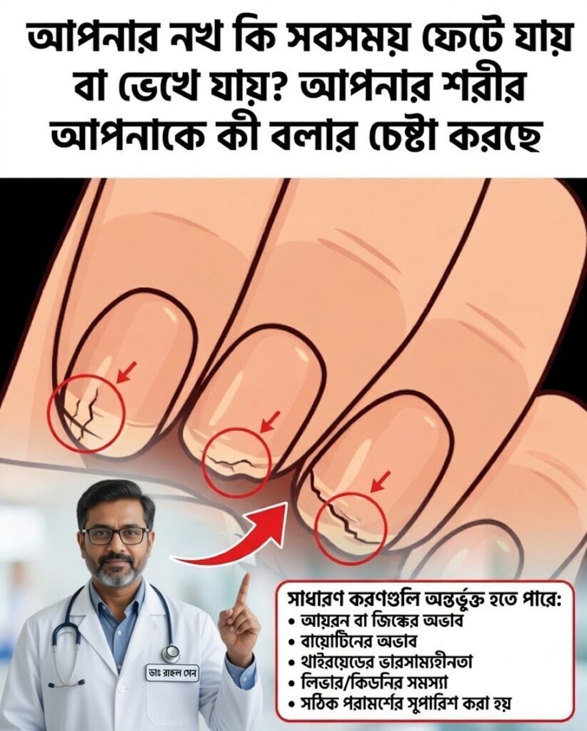 আপনার নখ কি বারবার ফেটে যায়, স্তরে স্তরে খোসা ওঠে, বা যতই যত্ন নিন না কেন ঠিকমতো বড় হতে চায় না? দুর্বল, ভঙ্গুর নখের কারণে কি কখনও হাত লুকিয়ে রাখতে ইচ্ছে করেছে? অনেক সময় এটি শুধু সৌন্দর্যের সমস্যা নয়—শরীর ভেতর থেকে কোনো ঘাটতির ইঙ্গিতও হতে পারে।