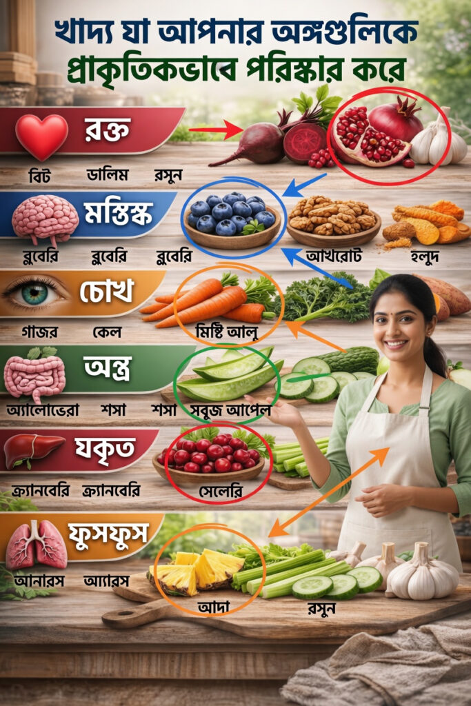 শরীরের স্বাভাবিক পরিষ্কার ও ভারসাম্য রক্ষার প্রক্রিয়াকে সহায়তা করতে জটিল পণ্য বা অতিরিক্ত ব্যয়বহুল উপকরণের প্রয়োজন হয় না। প্রকৃতির দেওয়া পুষ্টিসমৃদ্ধ খাবার নিয়মিত খাওয়াই যথেষ্ট। সঠিক খাদ্য নির্বাচন করে আপনি আপনার অঙ্গগুলোকে সেই উপকরণ দিচ্ছেন, যা দিয়ে তারা স্বাভাবিকভাবেই নিজেদের কাজ আরও ভালোভাবে করতে পারে।