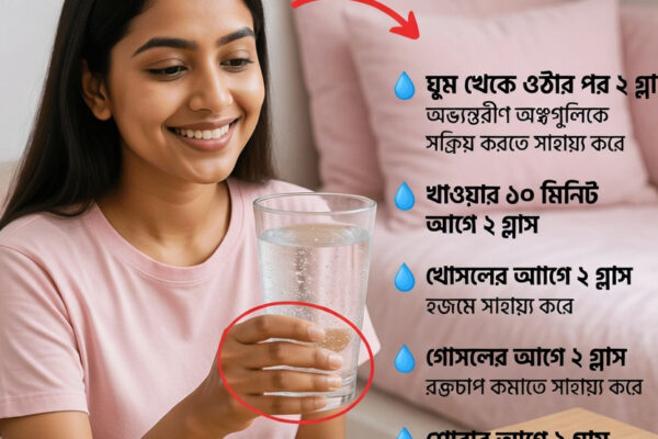 - সারাদিন: নিয়মিত বিরতিতে পানি পান, লক্ষ্য ৮–১২ গ্লাস