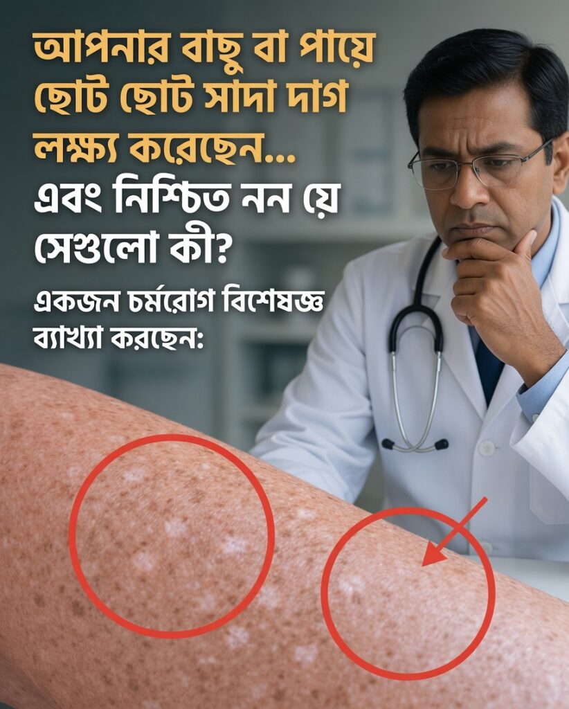 আপনি হয়তো লক্ষ্য করেছেন—হাত বা পায়ে আগে না থাকা ছোট ছোট সাদা দাগ দেখা দিচ্ছে, আর সেটাই ভেতরে ভেতরে অস্বস্তি তৈরি করছে। দাগগুলো সাধারণত সমতল, আলোকে অন্যভাবে প্রতিফলিত করে এবং ত্বক ট্যান হলে আরও স্পষ্ট লাগে—বিশেষ করে ৪০-এর পর। ফলে অনেকেরই মনে প্রশ্ন আসে: এটা কি বয়সের ছাপ, রোদে ক্ষতি, নাকি আরও গুরুতর কিছু? গরমে ছোট পোশাক পরার আগে দ্বিধাও তৈরি হতে পারে।