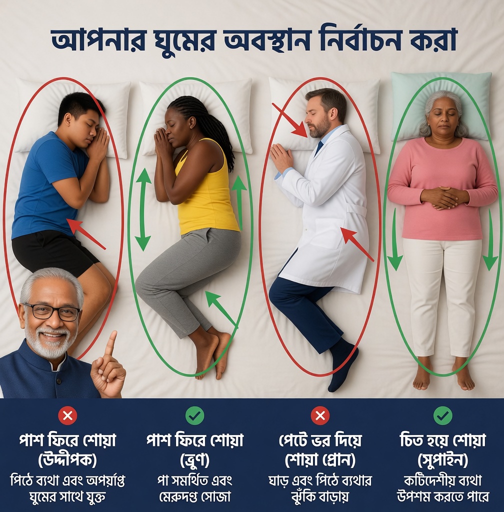 আপনি কি কখনও ঘুম থেকে উঠে নিজেকে ক্লান্ত, শরীর শক্ত হয়ে যাওয়া, বা কোনো স্পষ্ট কারণ ছাড়াই ব্যথায় ভুগতে দেখেছেন? ৫০-এর পর অনেকেই এমন রাত কাটান—ঘুম ভাঙে বারবার, সকাল শুরু হয় অস্বস্তি নিয়ে। এখন একবার ভেবে দেখুন: আপনার ঘুমানোর ভঙ্গি কি অজান্তেই আপনার স্বাস্থ্যে নেতিবাচক প্রভাব ফেলছে? কারণ, ঘুমের অবস্থানে সামান্য পরিবর্তনও আপনার শক্তি, মেজাজ, এমনকি রাতে শরীরের রিকভারি প্রক্রিয়া বদলে দিতে পারে।