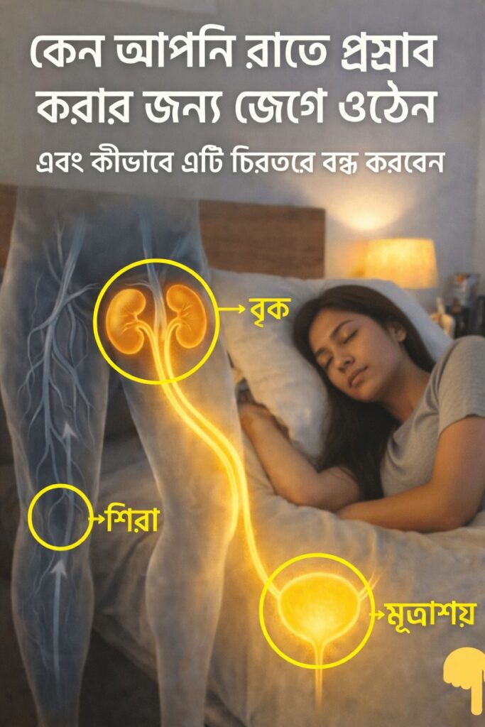 রাতে শুয়ে পড়লে শরীর সমান হয়ে যায়, ফলে নিচে জমে থাকা এই তরল রক্তে ফিরে আসে। কিডনি এই অতিরিক্ত তরলকে প্রস্রাব হিসেবে বের করে দেওয়ার চেষ্টা করে, আর তাই মাঝরাতে বারবার টয়লেটে যেতে হয়।