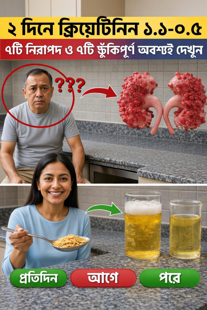 অনলাইনে মাঝে মাঝে এমন দাবি দেখা যায় যে বিয়ার বা প্রচুর চিনাবাদাম খেলে ক্রিয়েটিনিন দ্রুত কমে যেতে পারে। কিন্তু ন্যাশনাল কিডনি ফাউন্ডেশনের মতো নির্ভরযোগ্য সূত্র বলছে, অ্যালকোহল শরীরকে ডিহাইড্রেট করতে পারে এবং সময়ের সঙ্গে কিডনির ওপর অতিরিক্ত চাপ ফেলতে পারে। ফলে উপকারের বদলে ক্ষতির সম্ভাবনাই বেশি।