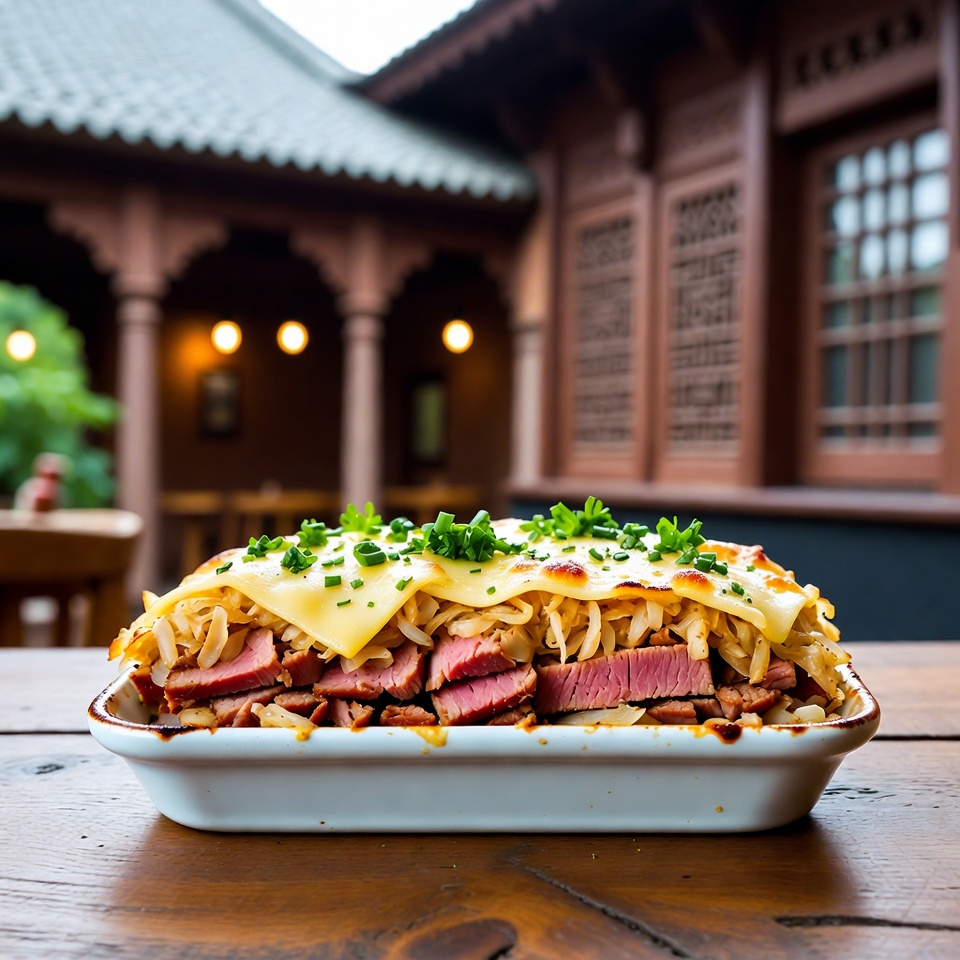 কর্নড বিফ, সাওয়ারক্রাউট ও সুইস চিজের স্তরে করা রিউবেন বেক