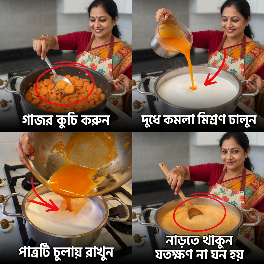 3. সিমার করুন: ফুটন্ত দুধে গাজরের টুকরো দিয়ে কম আঁচে ১০ মিনিট রান্না করুন।