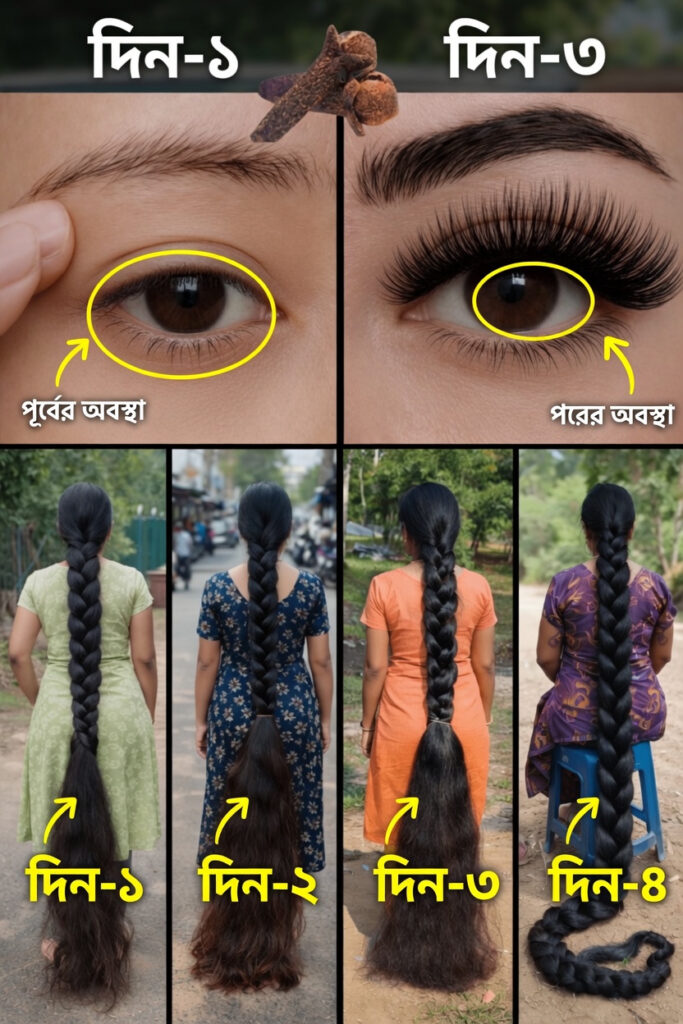 এই অংশটিই অনেকের কাছে সবচেয়ে আকর্ষণীয়। সামাজিক মাধ্যমে প্রায়ই এমন তুলনামূলক ছবি দেখা যায়, যেখানে প্রথম দিনে ভ্রুর পাশে একটি লবঙ্গ দেখানো হয়েছে, আর কয়েক দিনের মধ্যে চোখের পাতা বেশি ঘন বলে দাবি করা হয়েছে। এসব ছবি আগ্রহ তৈরি করলেও মনে রাখতে হবে—ফল ব্যক্তি ভেদে ভিন্ন হয়, কারণ চুলের বৃদ্ধির স্বাভাবিক চক্র সবার এক নয়।