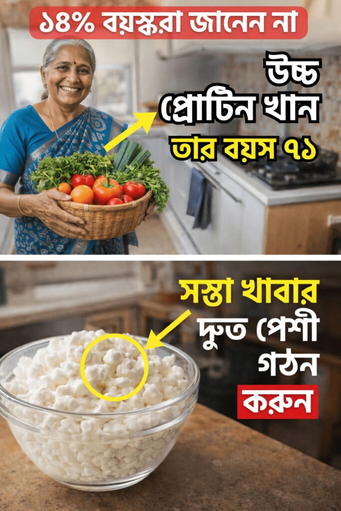 কটেজ চিজ দেখতে সাধারণ হলেও এটি অত্যন্ত সস্তা এবং উচ্চ-প্রোটিনসমৃদ্ধ একটি খাবার। আধা কাপ কটেজ চিজে প্রায় ১৪ গ্রাম প্রোটিন থাকে, আবার চর্বিও তুলনামূলক কম। এর স্বাদ মৃদু এবং পেটে আরামদায়ক, তাই প্রবীণদের জন্য এটি ভালো একটি বিকল্প।