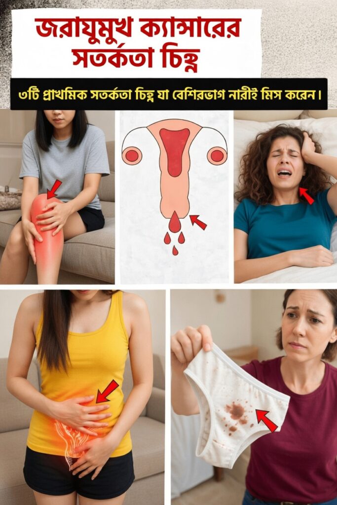 এই লেখায় আমরা জরায়ুমুখের ক্যান্সারের সম্ভাব্য কিছু সতর্ক সংকেত নিয়ে কথা বলব, যেগুলো নিয়ে Mayo Clinic, American Cancer Society, CDC-এর মতো বিশ্বস্ত প্রতিষ্ঠানগুলো বারবার সতর্ক করেছে। শেষ পর্যন্ত পড়ুন—শেষে থাকছে খুব সহজ কিছু করণীয়, যেগুলো আজ থেকেই নিজের স্বাস্থ্যের জন্য প্রয়োগ করতে পারেন।