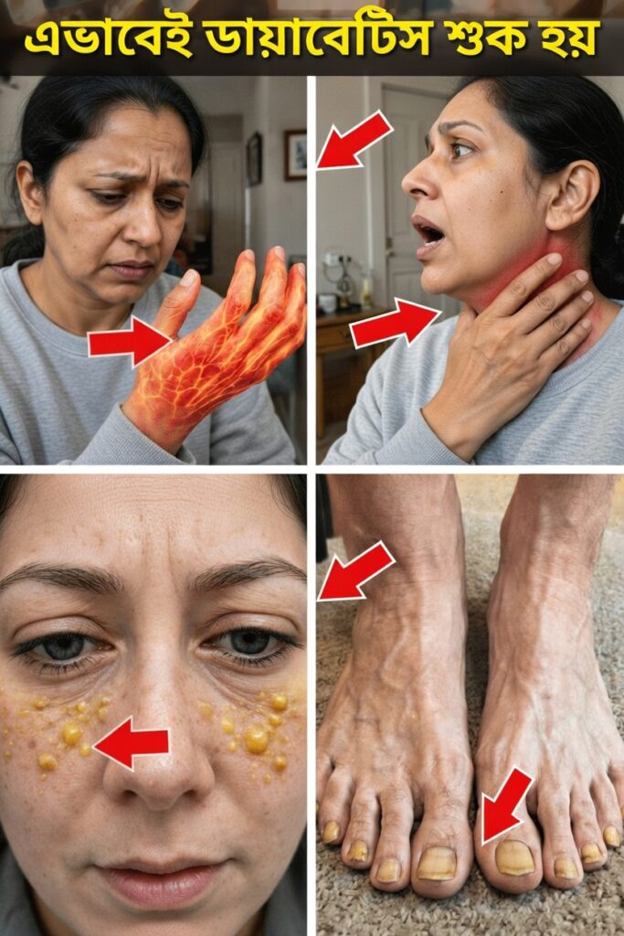 আরও একটি গুরুত্বপূর্ণ বিষয় হলো, কিছু লক্ষণ ত্বকে দেখা যায় বা শরীরের এমন অনুভূতির মাধ্যমে প্রকাশ পায়, যা প্রথমে রক্তে শর্করার সঙ্গে সম্পর্কিত বলে মনে নাও হতে পারে।