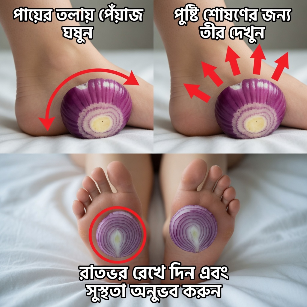 - পা গরম রাখুন: পা ঠান্ডা থাকলে শোষণ কম হতে পারে—তাই পেঁয়াজ দেওয়ার আগে পা উষ্ণ রাখার পরামর্শ দেওয়া হয়।