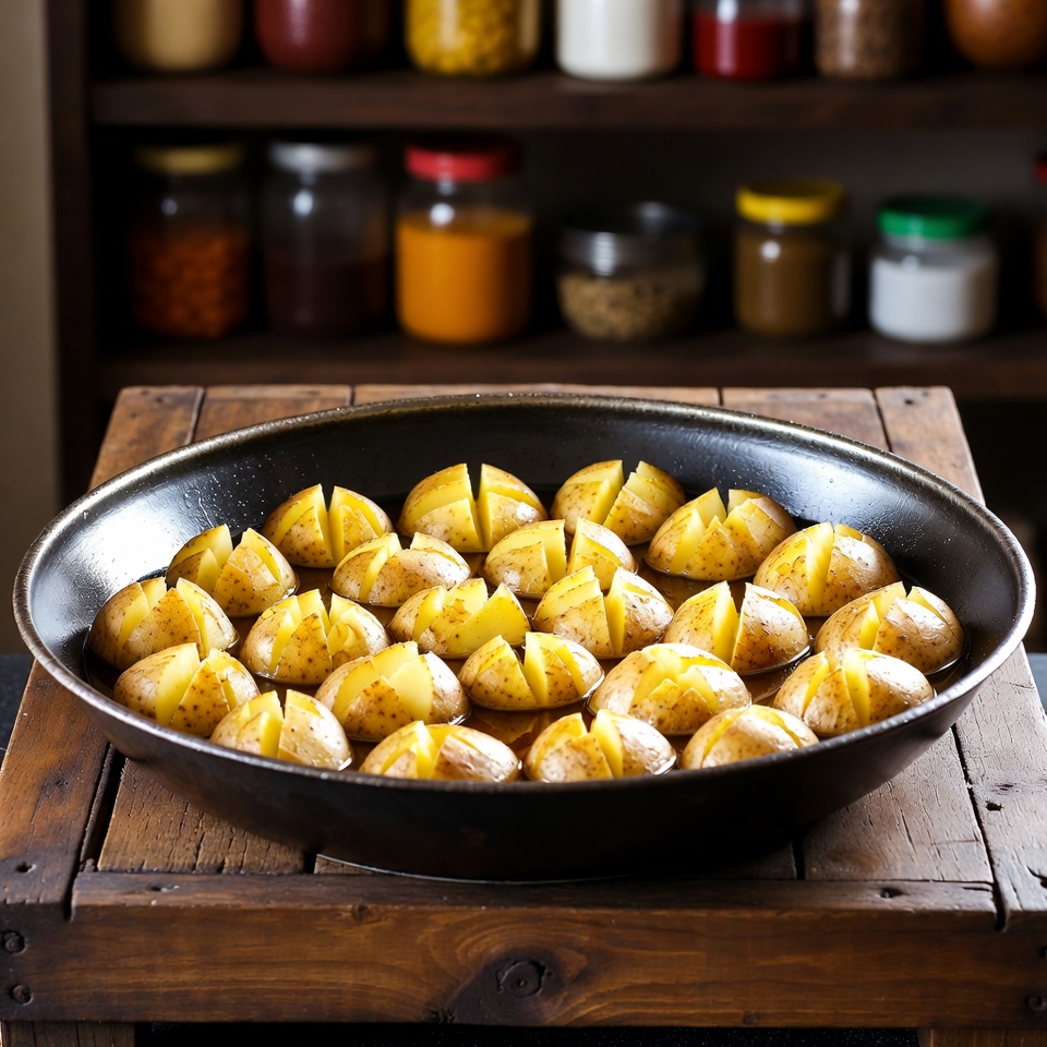 3. একটি ধারালো ছুরি দিয়ে প্রতিটি আলুর ওপর আড়াআড়ি ও লম্বালম্বি হালকা কাট দিন, যেন ক্রিসক্রস নকশা তৈরি হয়। কাটগুলো প্রায় ১/৪ ইঞ্চি গভীর হবে।