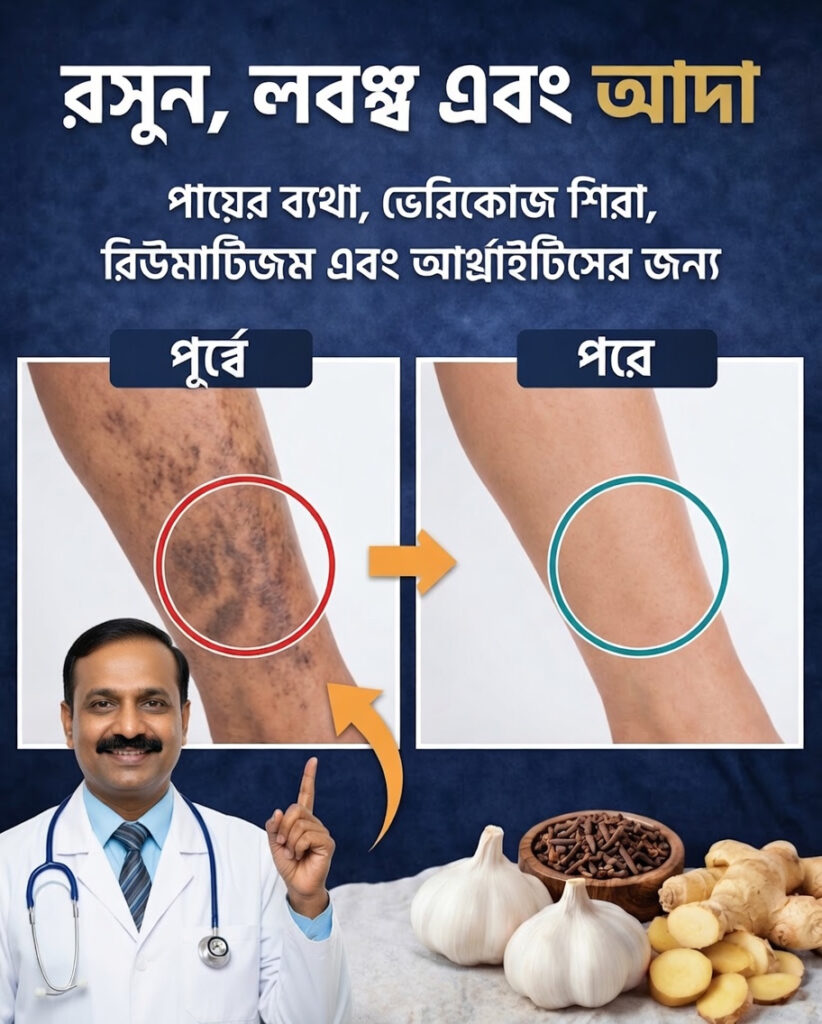 রসুন, লবঙ্গ ও আদা রাতারাতি ভ্যারিকোজ ভেইন দূর করে দেবে—এমন আশা করা ঠিক নয়। তবে নিয়মিত ও সঠিকভাবে ব্যবহার করলে এগুলো পায়ে আরাম, হালকাভাব এবং দৈনন্দিন স্বস্তি বাড়াতে সাহায্য করতে পারে। এখানে সবচেয়ে বড় বিষয় হলো নিয়মিততা।