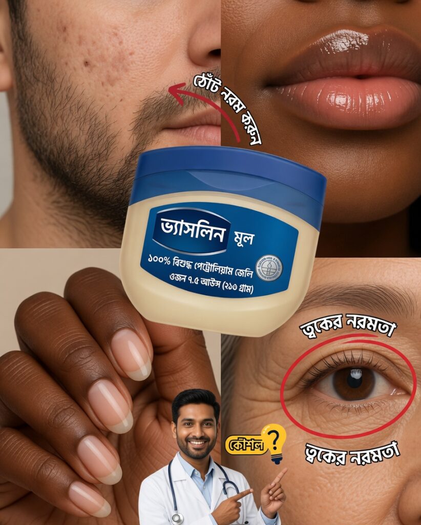 অনেকে প্রতিটি সমস্যার জন্য আলাদা করে দামি ক্রিম, তেল, বা স্পেশাল প্রোডাক্ট কেনেন। কিন্তু সেগুলো সবসময় পুরোপুরি কাজ করে না, আবার খরচও বাড়ে। ভ্যাসলিনের সুবিধা হলো—এটি সাধারণত একটি সুরক্ষামূলক স্তর তৈরি করে, যা ত্বকের আর্দ্রতা বের হয়ে যাওয়াকে কমায় এবং অনেক ক্ষেত্রে ঘর্ষণও কমাতে সাহায্য করে।