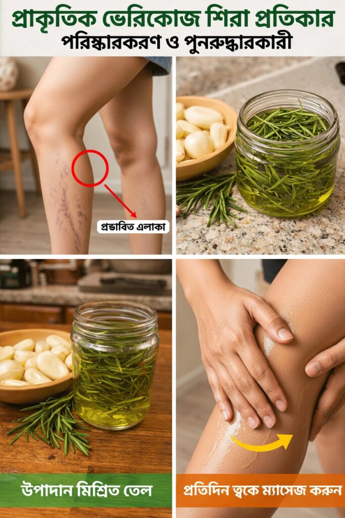 না। রসুন ও রোজমেরি–সমৃদ্ধ তেল কিছু মানুষের ক্ষেত্রে পায়ের আরাম, হালকা সঞ্চালন সহায়তা বা ভারী ভাব কমাতে সাহায্য করতে পারে, কিন্তু এগুলো ভেরিকোজ ভেইন পুরোপুরি দূর করে বা উল্টে দেয় না। দীর্ঘমেয়াদি ও কার্যকর ব্যবস্থাপনার জন্য পেশাদার মূল্যায়ন ও প্রয়োজনীয় চিকিৎসা খুবই গুরুত্বপূর্ণ।