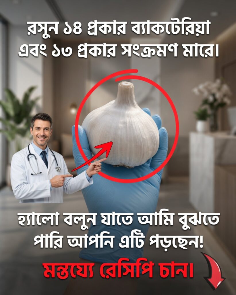 - কাঁচা রসুন: ১–২ কোয়া থেঁতলে ১০ মিনিট রেখে দিন, তারপর খাবারের সঙ্গে খান