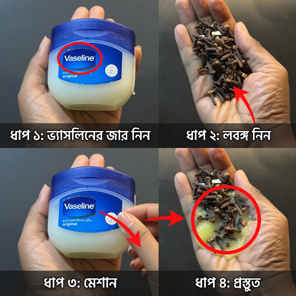লবঙ্গের ভেতরের গুরুত্বপূর্ণ উপাদান ইউজেনল (eugenol) হালকা প্রাকৃতিক অবশকারী (mild natural anesthetic) হিসেবে পরিচিত। আর ভ্যাসলিন (পেট্রোলিয়াম জেলি) ত্বকের উপর একটি ঘন সিল/বাধা তৈরি করে, যা উষ্ণতা ধরে রাখতে এবং শুষ্কতা কমাতে সাহায্য করে। ফলে ক্লান্ত অঙ্গ-প্রত্যঙ্গে থাকা কঠিনভাব ও ব্যথাব্যথা অনুভূতি কমে, চলাফেরা আরও স্বচ্ছন্দ লাগে। নিয়মিত ব্যবহার করলে রুক্ষ গোড়ালি নরম করতে এবং শরীরকে দ্রুত আরামদায়ক ও মসৃণ অনুভব করতেও সহায়তা করতে পারে।