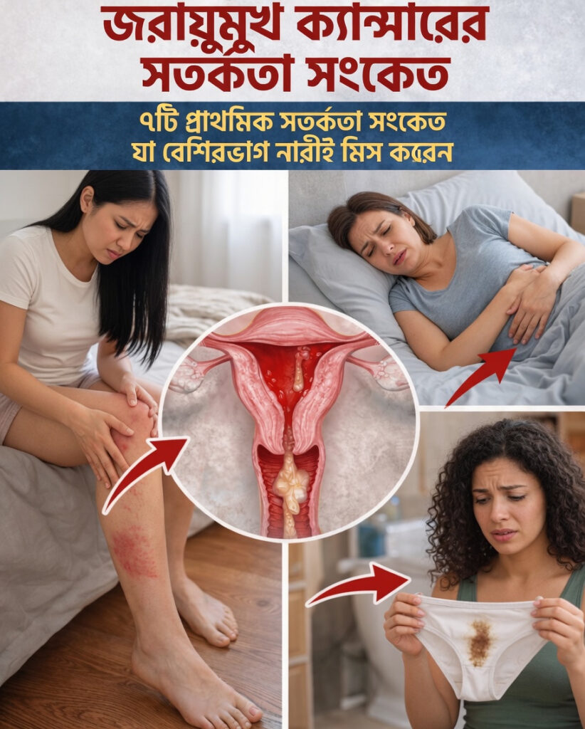 জরায়ুমুখের ক্যান্সার বা সার্ভিকাল ক্যান্সার অনেক সময় একেবারে প্রাথমিক পর্যায়ে স্পষ্ট কোনো উপসর্গ ছাড়াই তৈরি হতে পারে। এই কারণেই নিয়মিত স্ক্রিনিং প্রতিটি নারীর জন্য খুবই গুরুত্বপূর্ণ। রোগের পরিবর্তন বাড়তে থাকলে শরীর কিছু সংকেত দিতে শুরু করতে পারে, যা জানিয়ে দেয় যে বিষয়টি গুরুত্ব দিয়ে দেখা দরকার।