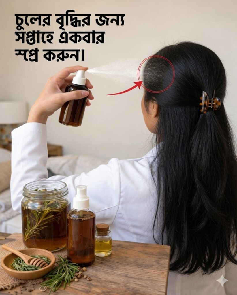 - স্ক্যাল্পে সরাসরি স্প্রে করুন (চুল শুকনো বা ভেজা—দুই অবস্থাতেই করা যায়)